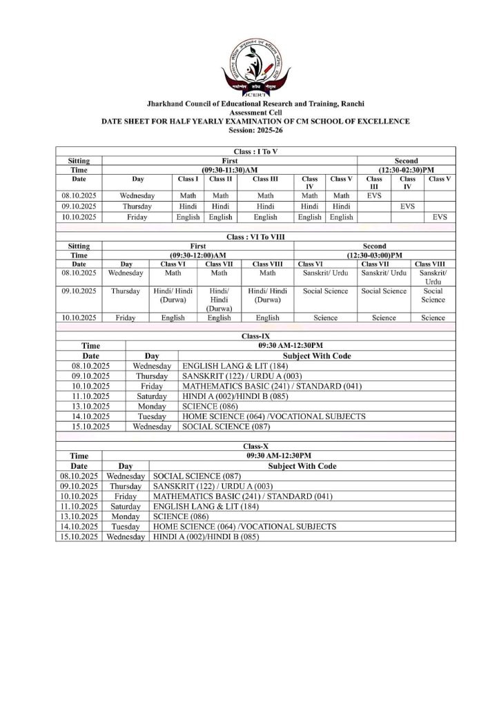 The Jharkhand Academic Council (JAC) has released the half-yearly exam time table for classes 1 to 12 for the 2025-26 school year. These exams will happen in October 2025 and help students get ready for their final board exams. They will be held offline in schools, with easy questions for younger classes and board-style questions for classes 9 to 12. Check the timetable on JAC.