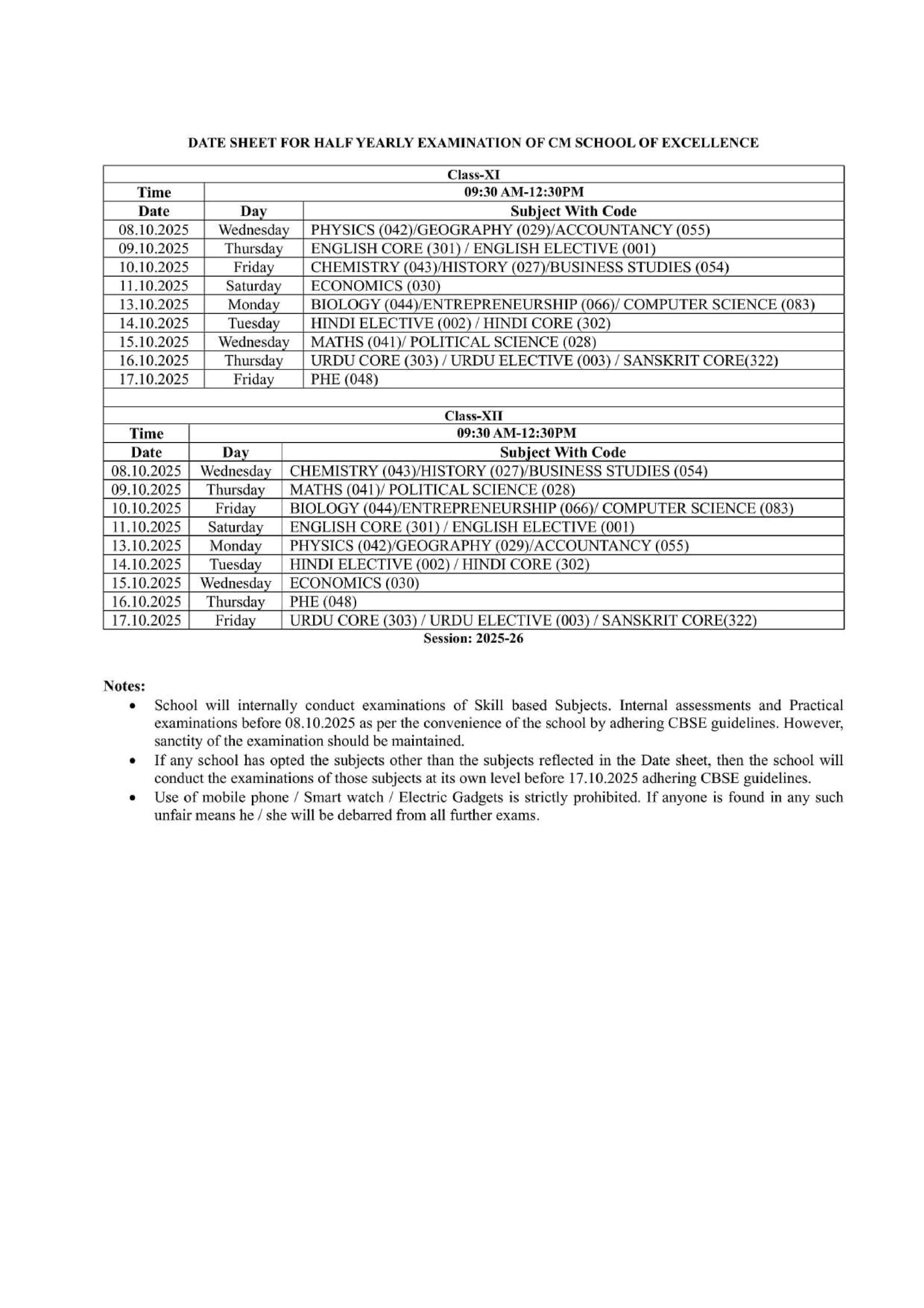 JAC half yearly Exam Time Table PDFDownload PDF
